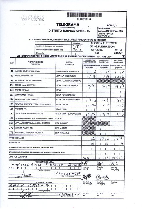 También puede buscar usted mismo las mismas discrepancias entre telegramas y resultados finales, y le apuesto una bolsa de boletas falsas a que en cada investigación habrá damnificados diferentes, necesarios para acomodar los resultados a dedo sin que salten las alarmas.
